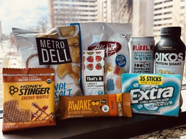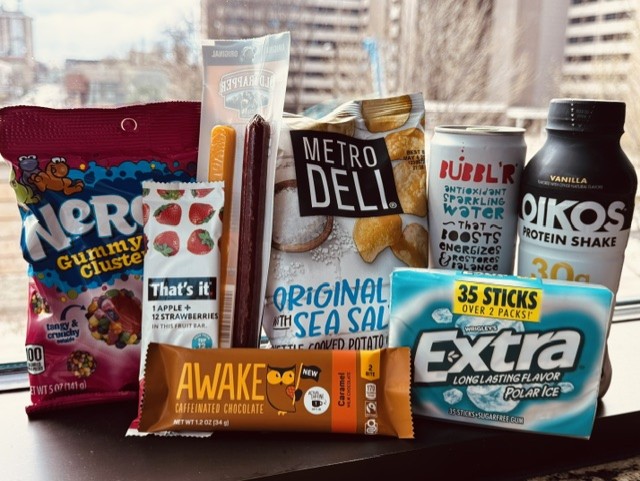 This assortment of study snack favorites is perfect for a night of intense studying. The package includes Wrigley's Extra Polar Ice Big Pack Gum, That¿' It Apple Strawberry Bar, Old Trapper Beef and Cheese, Awake Caffeinated Chocolate Caramel Bar, Nerds Gummy Cluster Rainbow, Metro Kettle Chips - Sea Salt, Oikos Protein Shake - Vanilla, Bubbl'r - Twisted Elix'r, & a Housing Reusable Bag